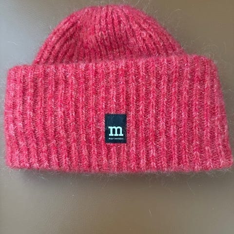 Marimekko Reivi pipo, väri punainen. Materiaalina villa+ mohair.Koko one size. Pipossa on käännetty reunus ja edessä Marimekko-logomerkki. Sopii aikuiselle käyttäjälle, mitoitus joustava neuloksen ansiosta.