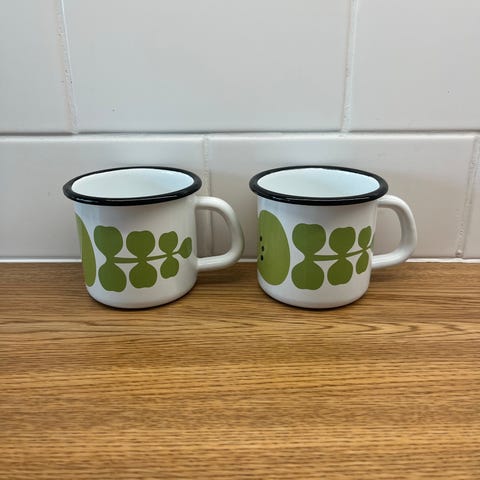 Hackman emalimuki, jossa monivärinen vihannesaiheinen kuvitus ja musta reunus. Valkoinen sisäpinta ja ulkopinta, pohjassa Hackman-merkinnät ja hoito-ohjeiden symbolit. Sopii esimerkiksi juomamukiksi tai keittiön yleiskäyttöön.