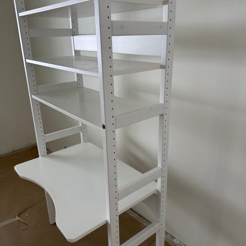 Lattiapaneeleja/tikkaita kolme. 80cm levysiä hyllylevyjä kuusi. 100 cm levysiä hyllylevyjä neljä. Useita korkeussäätöreikiä hyllyjen paikan muuttamiseen. Soveltuu esimerkiksi lastenhuoneeseen.