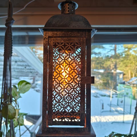 Toimiva musta valaisin, halkaisija noin 30 cm, sähköliitäntä valaisinpistotulpalla.