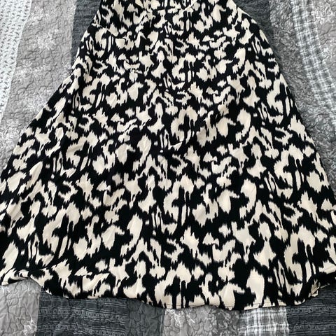 Ihana pitkä "farkku"-hame isoilla taskuilla. Napit saa auki. Väri on oranssinruskea?, kuviin vaikea saada oikeaa väriä. Liian iso itselle, joten menee seuraavalle.