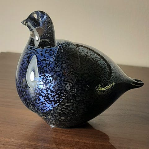 Lasinen lintufiguuri koriste-esine. Veistoksessa on sininen, pisaranmuotoinen runko, jossa on valkoisia kuvioita, sekä kirkas lasinen kaula ja pää. Alaosa on pyöristetty ja painava, mikä tekee esineestä tukevan. Sopii sisustukseen koriste-esineeksi esimerkiksi hyllylle tai vitriiniin.