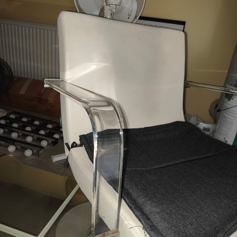 Maletin jämäkkä kampaamotuoli. Istuimessa pientä nirhauma, mutta on kuitenkin ehjä eikä haittaa käyttöä.