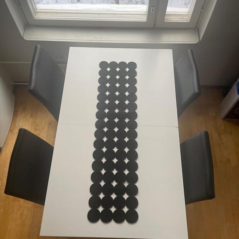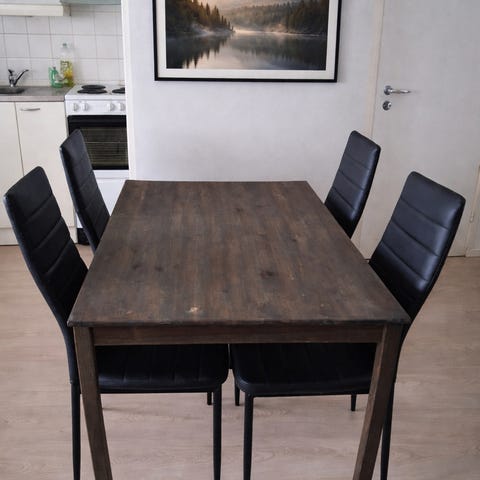 Ruokapöydässä Ikean pöytälevy ja Maskun ruokapöydästä mustat teräsjalat. Pöydän mitat: leveys 80cm, pituus 160cm ja korkeus 74,5cm