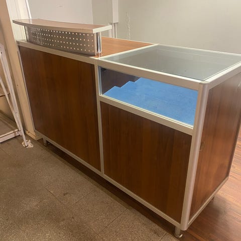 Itse rakennettu pelipiste/asiakaspiste kampaamoon.