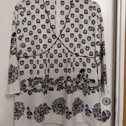 Korkeahko pyöreä pääntie. 3/4 pituiset hihat. Noin polvipituinen mekko. Joustaa hieman. Ruudullinen ja kukonaskel kuviointi. Raidalliset kaulus ja hihansuut.