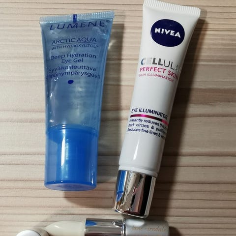 Lumene Ajaton, Nordic Ageless, radiant youth night cream 50 ml. Lumene Ajaton, Nordic Ageless Multi-Peptide-Serum 30 ml. Lumene Herkkä, Nordic Sensitive, rich eye cream (silmänympärysvoide) 15 ml. Kaupan päälle tulee kosmetiikkalaukku (se on Clarins - merkkinen). Yhteensä 70 euroa, nouto Myllypuro, mobilepay ei käy. Tarvittaessa voin tuoda Myllypuron metroasemalle.