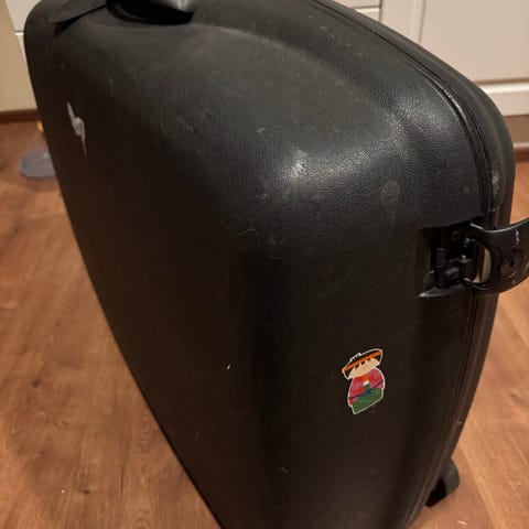 Samsonite matkalaukku mitat: 79x28x54. Kova muovinen kuori ja musta väri. Laukussa on vetokahva ja pyörät helpottamaan kuljettamista sekä sivukahva nostamista varten. Ulkopinnassa näkyy käytön jälkiä kuvien mukaisesti.