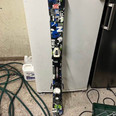 Huom. Toisen suksen siteet on kiinnitetty uudelleen sukseen kiinni pari senttiä alkuperäisestä kohdasta sen jälkeen kun side irtosi suksesta rinteessä. Katso kuvat. Sukset myydään noutona.