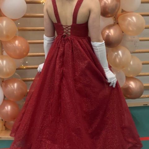 Kaksi kertaa käytetty tansseissa. Olkaimista hieman kulunut glitterkangas, mutta voi itse tai ompelijalla vaihtaa/päällystää mukana tulevasta lisäkankaasta. Mekosta löytyy myös taskut! Mukaan pukupussi sekä vannehame, kummatkin ehjiä.