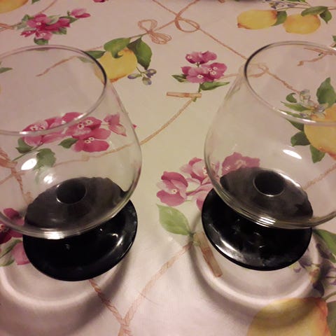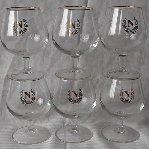 6 Luminarcin Napoleon-konjakkilasia, joissa kullanvärinen N-koristekuva ja seppele. Myös lasin yläreuna kullattu. Hinta 10 e.