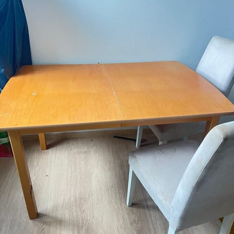 Musta pöytä (120x60x87) metallisilla jaloilla ja neljä tuolia irrotettavilla istuinsuojuksilla. Istuinosan korkeus 64cm. Yhdessä istuinsuojuksessa repeämä. Kaikki kalusteet vaativat jonkinnäköistä ruuvien kiristystä. Lisäksi pöytälevyssä kulumia.