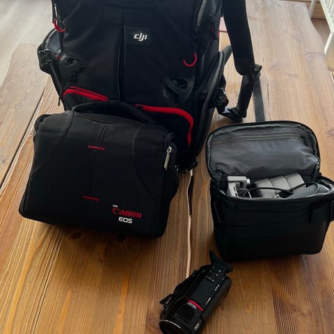 Valmis paketti kuvaukseen. Canon EOS 5D Mark2, DJI Mini 4 Pro, Panasonic 4K vid
