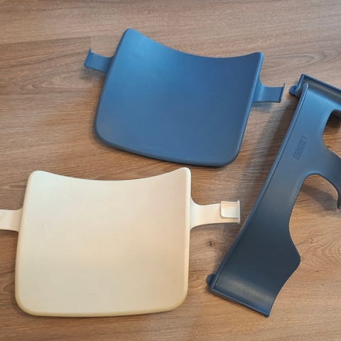 Stokke syöttötuoli. Väri valkoinen. Tuolissa on säädettävä istuin- ja jalkataso, jotka voidaan asettaa eri korkeuksille lapsen koon ja pöytäkorkeuden mukaan. Soveltuu lapselle ruokailu- ja leikkituoliksi pöydän ääreen.