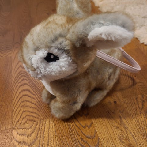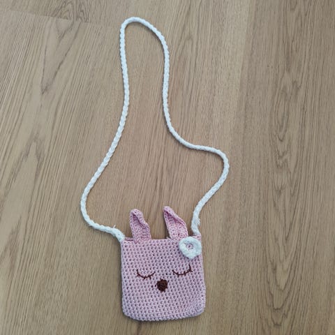 Myydään pehmoinen pupulaukku, jossa on metsllihihna. Hihnan pituutta mahdollista säätää tekemällä lenkki.