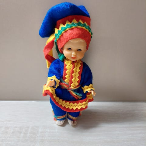 Lapin kauniiseen kansallispukuun pukeutunut nukke. Istuu.