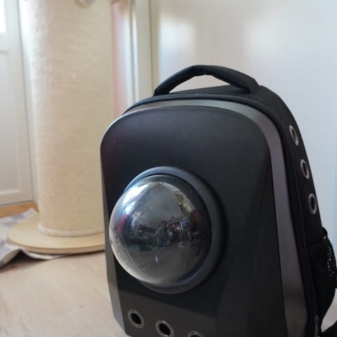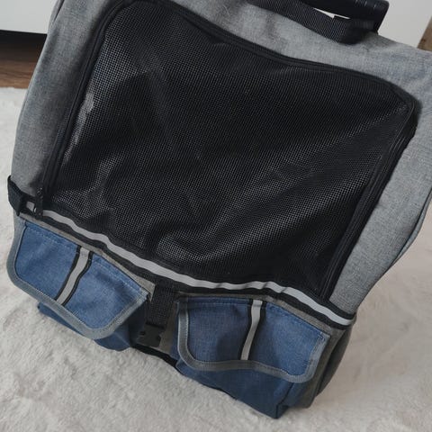 Lemmikkireppu, jossa läpinäkyvä ikkuna edessä, sivuilla verkot ilman vaihtumista varten.