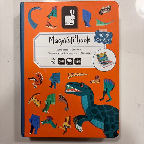 Janod - merkkinen ”magneettikirja” jonka aiheena koneet ja kulkuvälineet. Kantta yllä pitävät narut teipattu kiinni, leikitty mutta toimii.