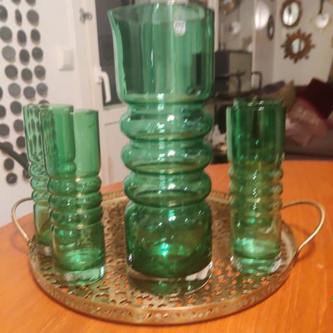 Tzarina sarjan mehu kannu sekä lasi väriltään keltainen uraani lasi suunnittelija Nanny still ja sarjan valmistanut Riihimäen lasi. Molemmat ehjiä kannu sekä lasi. Pohjassa vähäisiä siirtely jälkiä. Kannun korkeus 25.5 cm ja lasin korkeus 17 cm.