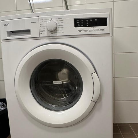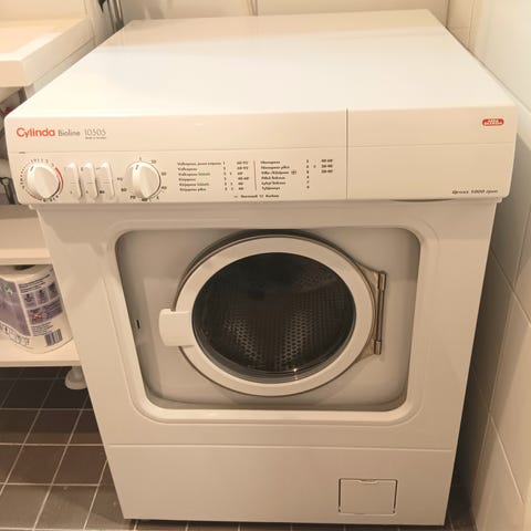 Cylinda edestä täytettävä pyykinpesukone. Vapaasti sijoitettava malli, valkoinen väri. Ohjauspaneelissa valintanuppi pesuohjelmille ja erilliset painikkeet asetuksille. Luukku edessä, kone sijoitettavissa esimerkiksi kylpyhuoneeseen tai kodinhoitohuoneeseen. Tarkemmat tiedot, kuten kapasiteetti, mitat ja energialuokka, kannattaa tarkistaa valmistajan merkinnöistä tai käyttöohjeesta.