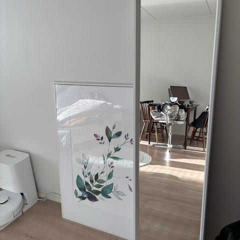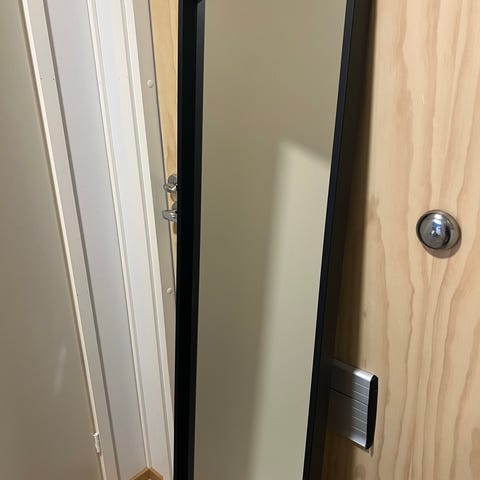 Ikean Nissedal mustakehyksinen peili. Mitat 150 x 65 cm, asennettavissa pystyyn tai vaakaan, voi kiinnittää seinälle tai pitää lattialla.