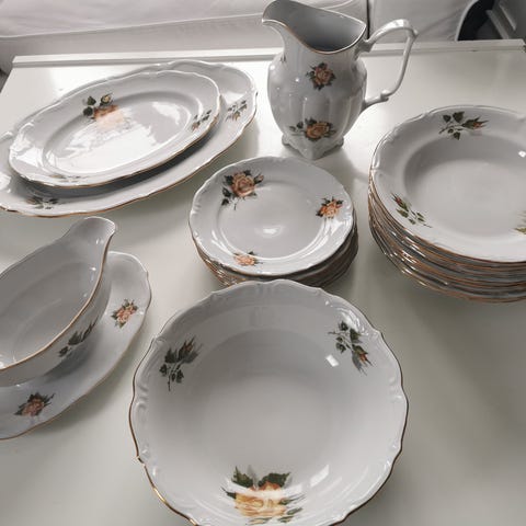 Keittolautasten pohjat siistit, reunoissa näkee hieman jälkiä. Leipälautaset siistit.