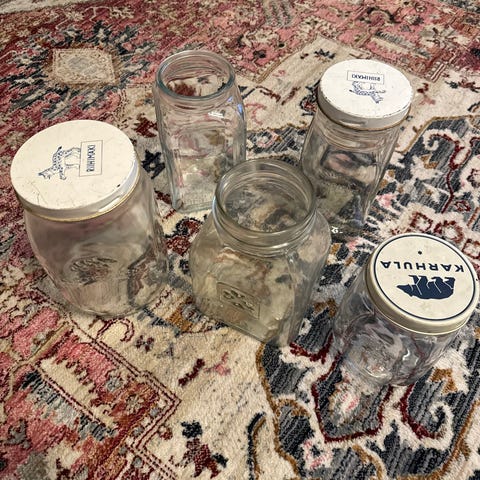 2 kpl Karhulan lasin ehjiä 1/2l vetoisia Ursus purkkeja bakeliittikannella,
