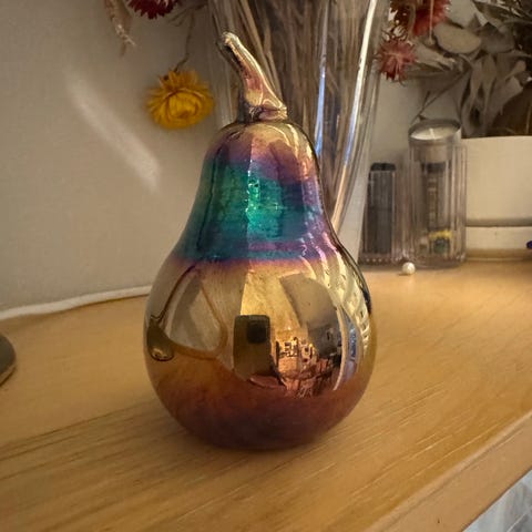 Kaunis, käsin veistetty päärynä koriste-esineeksi tai paperipainoksi. Materiaali onyks / onyx , jossa upeat luonnolliset raidat. Korkeus n. 9cm. Erinomainen kunto.