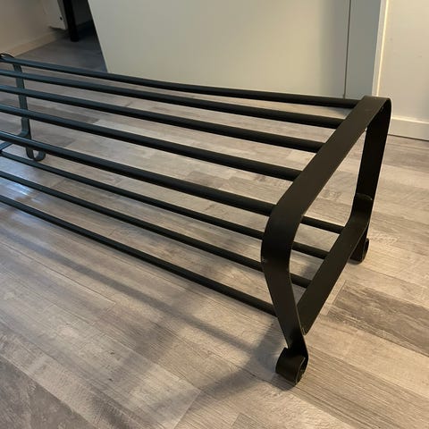 Valkoinen kenkäteline, jossa on useita mustia tankoja kenkien säilytykseen. Telineessä on kaksi tasoa ja se on suunniteltu käytettäväksi eteisessä tai muussa tilassa, jossa tarvitaan kenkien säilytystilaa.