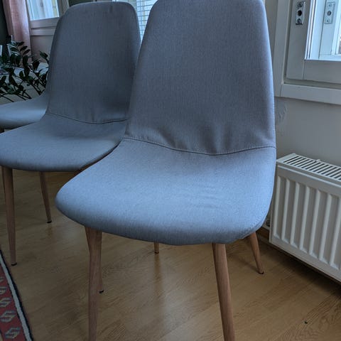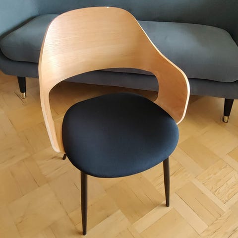 Jysk Favrbjerg tuoli. Jalat ovat puunväriset ja niissä on mustat tukirakenteet.