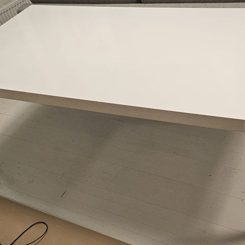 Valkoinen pöytä, valmistettu puusta ja päällä valkoinen maali. Tukevat paksut jalat ja runko. Yksinkertainen ja moderni muotoilu, sopii hyvin erilaisiin sisustustyyleihin. Maalipinnoilla käytön kulumaa, keskellä kääntyvä luukkuPöydän tyyli on moderni ja se on peräisin nykyaikaisesta skandinaavisesta muotoilusta, joka korostaa selkeitä linjoja ja käytännöllisyyttä.