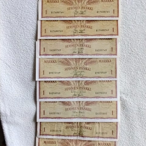 Suomalaisia markka ajan 1963 - 1993 1 markasta 20 markkaan seteleitä tarjolla. Kaikki 14 setelit kerta kaupalla nouto ja käteismaksu / Kirjepostikulu 4 euroa lisätään hintaan.