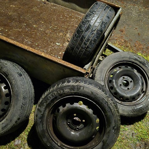 Siistit peltivanteet leveys 6 tuumaa ET47 päällä huonot nastarenkaat joista 1 puhki