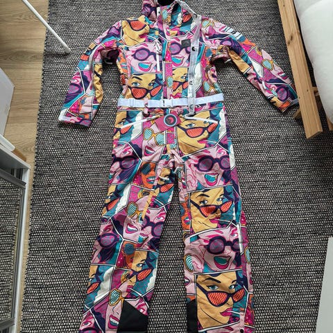 OOSC lasketteluhaalari monivärinen. Yksiosainen laskettelupuku, jossa huppu ja vyö vyötäröllä. Haalarissa on useita taskuja edessä sekä lahkeissa lumilukot ja nepparikiinnitys. Hihansuissa on tarrakiristys ja vetoketjulliset tuuletusaukot kainaloissa, sekä vasemmassa kädessä tasku hissilipulle. Kuosissa on kirkkaat värit ja graafinen kuviointi.