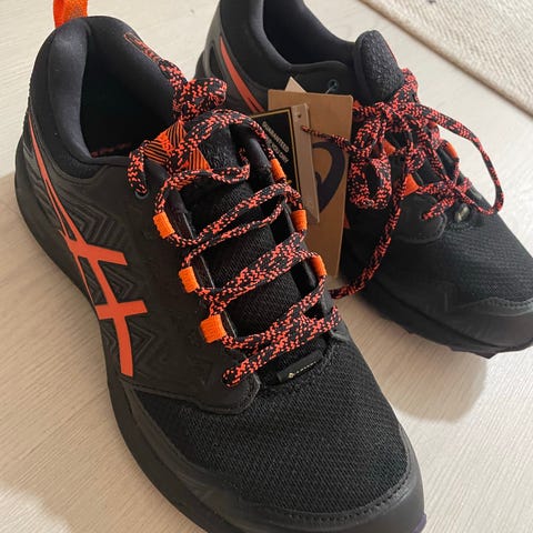 Alla torin tekoälyn näkemys kengistä: Asics Gel-FujiSetsu 3 G-TX nastajuoksukengät naisille. Kengän koko on 39.5 (us 8/25cm). Väri on musta, jossa on korostevärinä oranssinpunainen. Päällinen on suunniteltu juoksukäyttöön ja pohjassa on nastat paremman pidon takaamiseksi liukkailla alustoilla. Malli soveltuu erityisesti juoksuun ulkona vaihtelevissa olosuhteissa.
