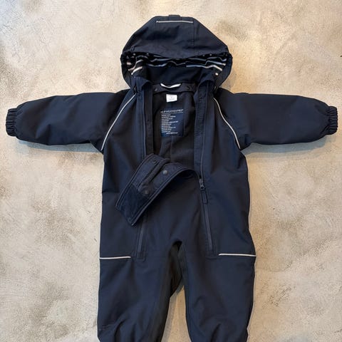 Uutena ostettu, yhden lapsen käyttämä. Tuulen- ja vedenpitävä kuorihaalari irrotettavalla fleecevuorella. Koko 86. Peppu ja polvet siistit.