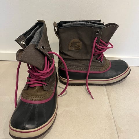 Naisten koon 38,5 Sorel-merkkiset talvikengät, joissa irrotettava huopavuori. Kengissä vedenpitävät kumikärjet. Käytetyt, mutta hyvässä kunnossa säilyneet. Savuton talous.