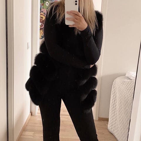 Tumman ruskea untuvaliivi hupulla, hupussa turkisreuna.