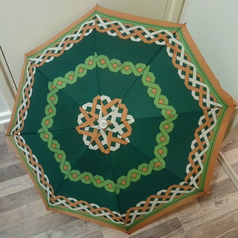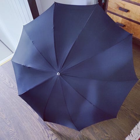 Musta, vanhempi sateenvarjo. Manuaalisesti avattava ja suljettava.