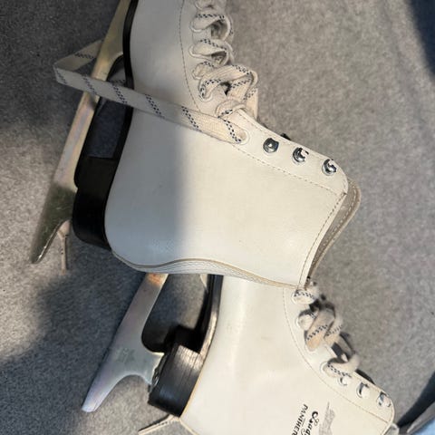 Lady taitoluistimet, koko 37. Valkoiset nauhalliset luistimet, joissa korkea varsi ja terät kiinnitettynä mustaan kantaan. Soveltuvat yleiseen luisteluun. Koko merkitty kengän sisäosaan numerolla 37.