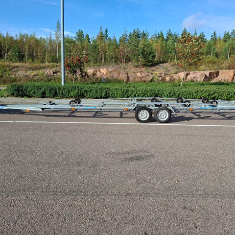 Traktorivetoinen ammattihitsarin tekemä traileri Raaseporissa, 4 säädettävää jalkaa, ollut 11 m veneellä painoltaan n. 7 t.