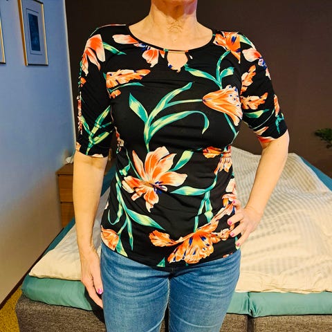 Naisten pusero koossa M. Pusero on valmistettu polyesteristä ja sen pääväri on punainen, mustalla pohjalla ja monivärisellä kuviolla. Mallissa on 3/4-pituiset hihat ja pyöreä kaula-aukko pienellä halkiolla. Sopii arki- ja vapaa-ajan käyttöön.