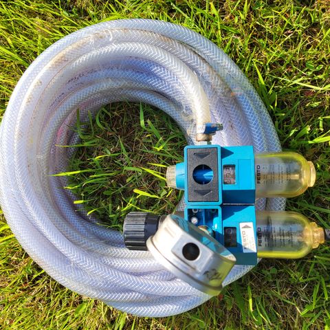 Tämä se on jo vähän retroa. Letkun pituus noin 8m. Letkuliitin puuttuu ja muutenkin taitaa olla puhdistuksen ja huollon tarpeessa.