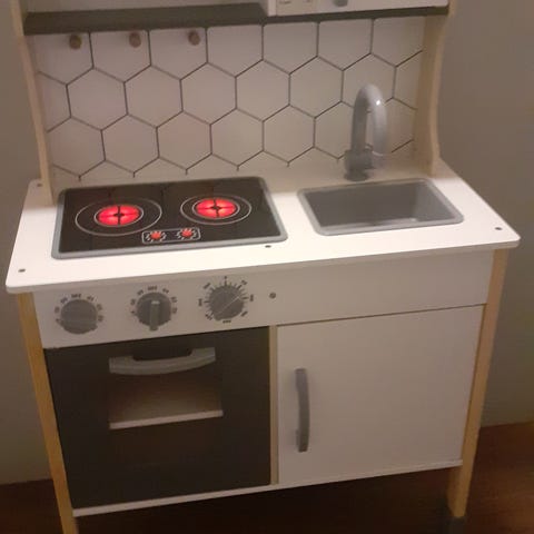 BRIO leikkikeittiö lapsille. Valkoinen ja musta keittiölelu, jossa on nelipaikkainen liesitaso, uuni avattavalla luukulla sekä kaappi säilytystilaksi. Yläosassa on pyöritettävät nupit ja digitaalinen näyttö uunin kohdalla (toimiva, kuuluu myös ääni valmiin ruuan merkiksi). Keittiössä on irrotettava tiskiallas sekä hana kuuma- ja kylmävesimerkinnöillä.