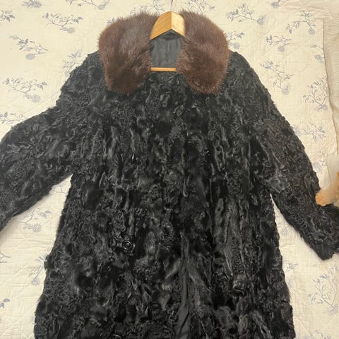 Hyväkuntoinen ja vähän käytetty turkki. Kuvassa 176cm mallin päällä. Toisessa hihassa hieman jotain tummaa, jota ei yritetty puhdistaa. Voi hyvinkin lähteä puhtaaksi, vaikka kostealla pyyhkimällä.