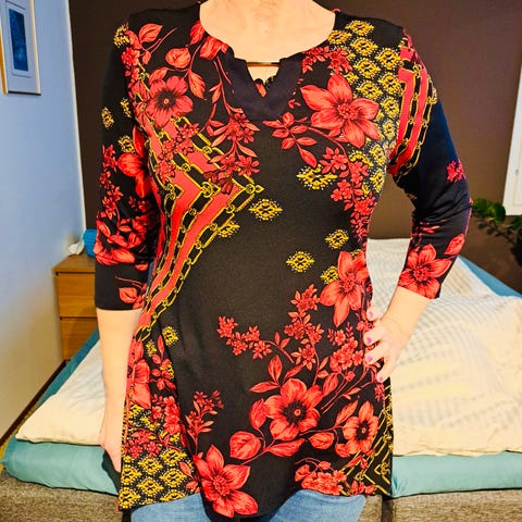 Naisten pusero kokoa S. Materiaalina polyesteri. Puserossa on lyhyet hihat ja pyöreähkö kaula-aukko. Väritys on vaaleapohjainen, jossa on monivärinen, koristeellinen kuvioprintti edessä. Sopii arki- ja vapaa-ajan käyttöön esimerkiksi farkkujen tai hameen kanssa.