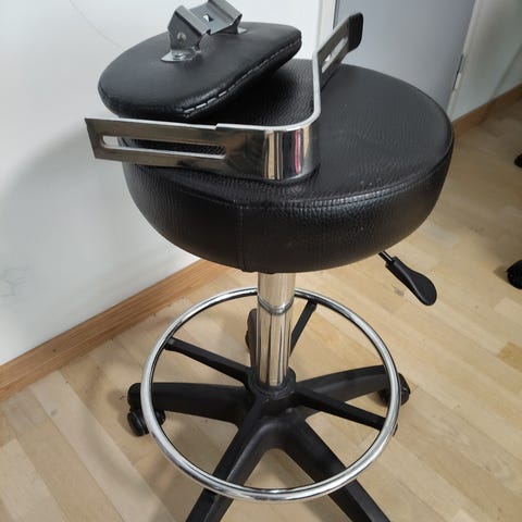 Säädettävä metallirunkoinen työtuoli, jossa viilutetut vaneriset istuin ja noja. Metallijalat levittäytyvät ~57 cm:n pituudelle halkaisijaltaan, ja istuinosan mitat ovat suunnilleen 42 x 37 cm (leveys x syvyys). Tuolin matalimmalla säädöllä istumakorkeus noin 45 cm ja korkeimmillaan 60 cm, joskin tuoli laskeutuu painoa ottaessaan. Ellei tämä johdu löysistä ruuveista tai muusta, ei työtuoli sovellu "baaripöydän" kanssa kovin hyvin yhteen.