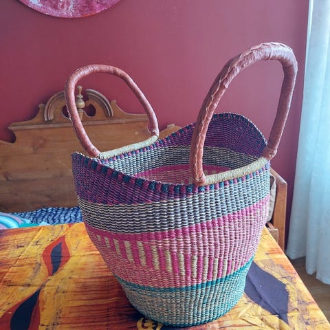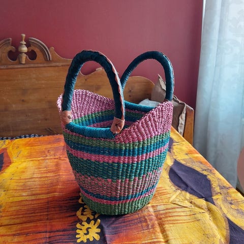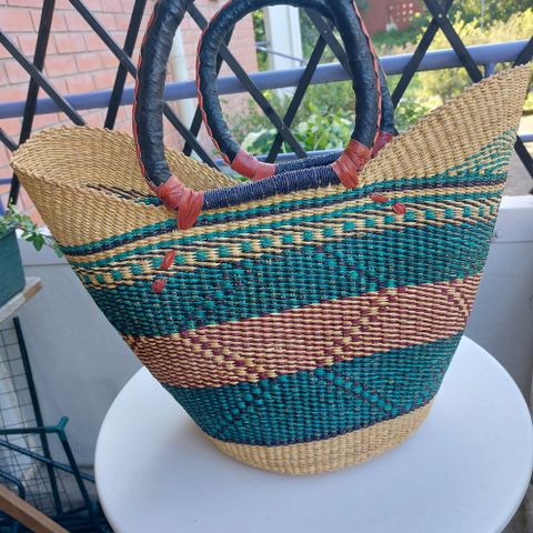 Elefanttiheinästä käsinpunottu korikassi, kestävä ja ekologinen. Voidaan kastella (sopii hyvin esim. Saunakassiksi). Perinteinen käsityö Bolgatangan alueelta.