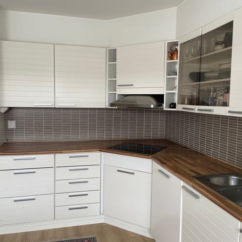 Keittiönkaapistot, jossa useita ylä- ja alakaappeja sekä laatikoita. Ovien väri murrettu valkoinen ja rungot tummaa kalustelevyä. Tumma työtaso koko keittiön pituudelta. Keittiössä on 60cm lattialiesi, liesituuletin, tiskiallas ja hana sekä 60cm varaus astianpesukoneelle(apk ei kuulu kauppaan). Toisella seinällä on kaapistoon upotettu mikroaaltouuni sekä korkea jääkaappi ja pakastin, joiden yläpuolella yläkaapit.