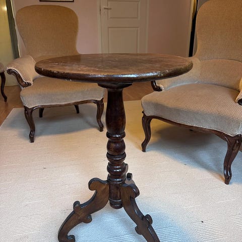 Hakusanat: puu, pöytä, sisustus, puupöytä, jalka, huonekalut, kaiverrus, koristeellinen, pyöreä pöytä, käytetyt huonekalut, tukeva